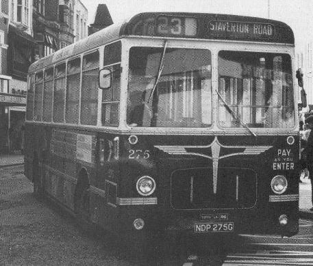The standard AEC Regent motor buses were supplemented by Bedfords in 1945/7 and Crossleys in 1950. The last Regents arrived in 1957 and, in the same year, the first of very a many standee-type single deckers entered service - initially on AEC Reliance chassis. Between 1962 and 1966, all double decker purchases were Dennis Lolines and Reading became the largest municipal operator of the type. A report received from the Transport Committee in 1966 recommended the replacement of all trolleybuses by motor buses and conversion was carried out between January 1967 and November 1968 using a fleet of special Bristol RELL single deckers with Strachan and Pennine bodies